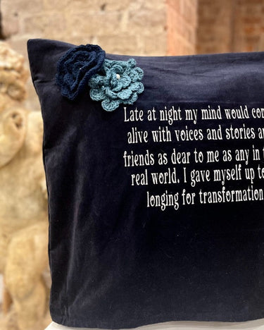 Handmade in rich navy velvet, the Little Women cushion features the full embroidered quote from Jo March - words that remind us of nights filled with imagination, voices and connection. Each cushion is available with or without hand-crocheted flowers, included at no extra cost.